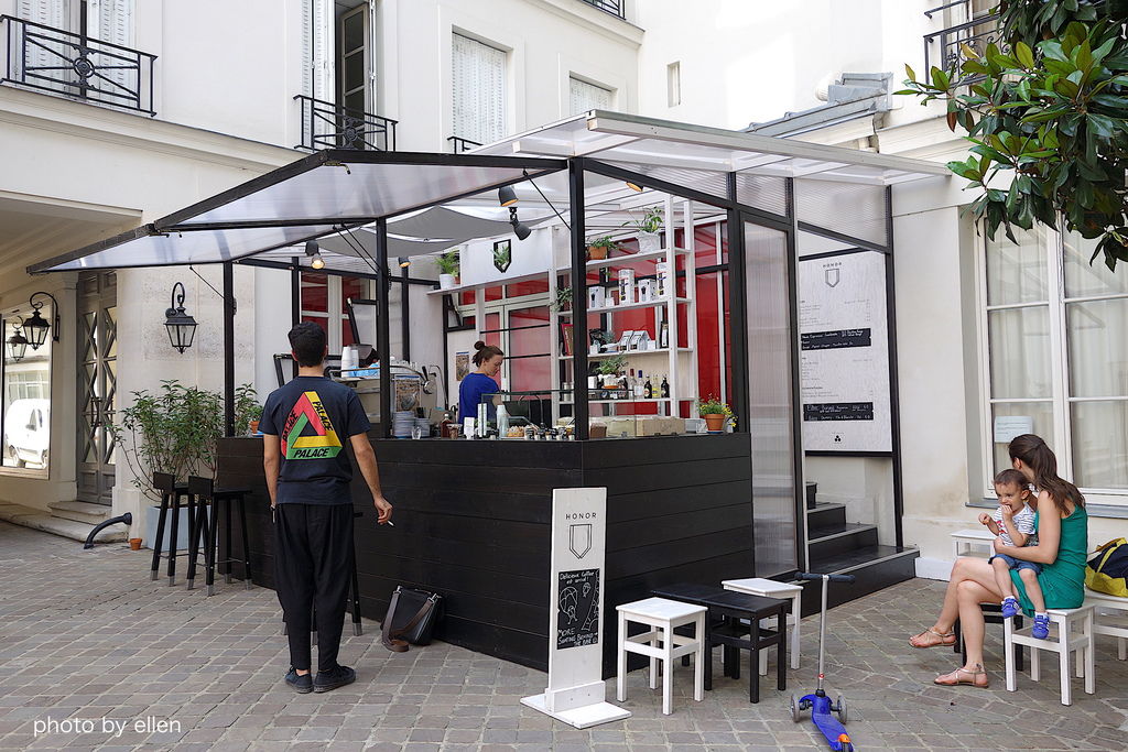 室外座位設置在人行道旁, 桌距座位間很擠很窄, 幾乎是快要到與鄰座的人並肩而坐的程度了! 我們被安排坐在最左側門前, 常有服務生進出, 被經過的客人或服務生碰撞到椅背是常有的事, 要有心理準備 ^^;;