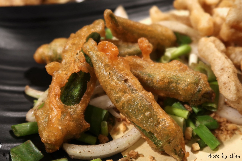 炸秋葵 & 炸甜不辣, 底下襯著洋蔥絲蔥花與炸蒜酥