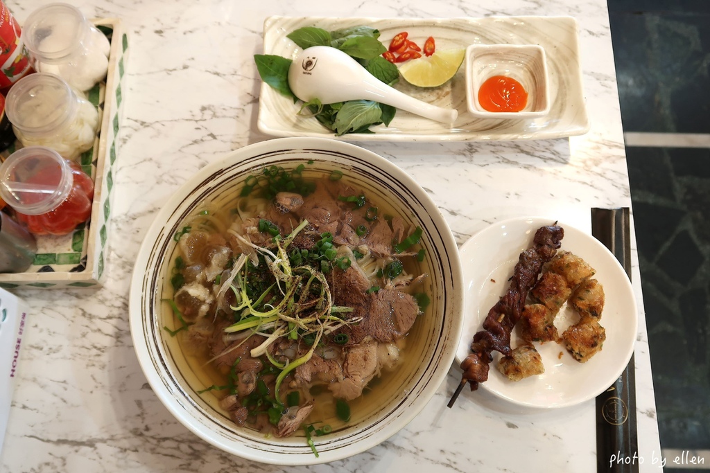 菜單menu種類簡單, 食物只有河粉/米線/法式麵包三種, 看是搭牛或雞肉, 湯或乾拌, 春捲肉串還有烤肉可單點, 優點是不需要點一整份可以單個點, 一個人來能吃多樣而不用怕吃不完浪費