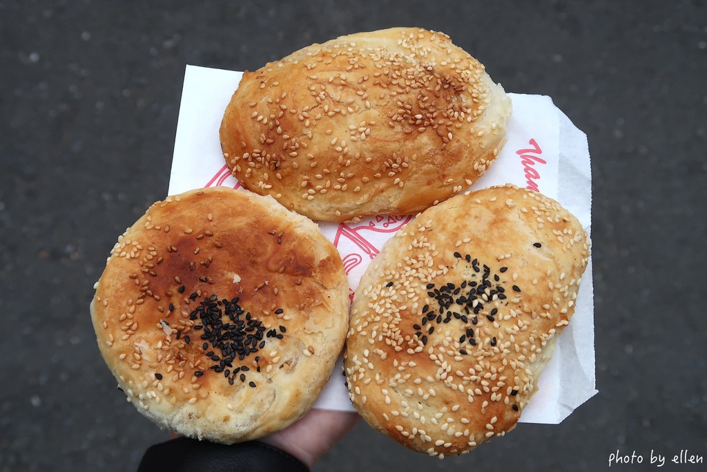 燒餅有甜鹹口味, 甜:白砂糖/黑糖, 鹹:豬肉/蔥花/蘿蔔絲, 無論哪種一個皆20元