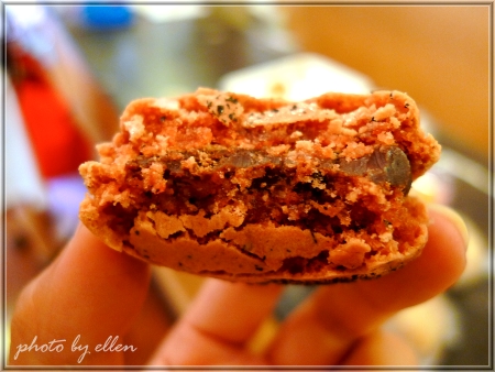 正在嘉義享用小吃時, 朋友突然拿幾個馬卡龍給我們吃