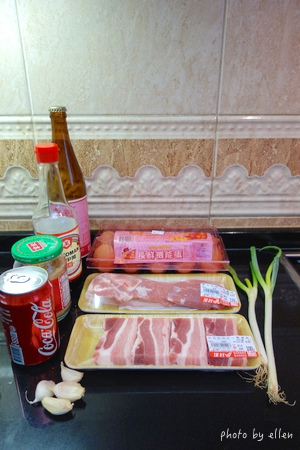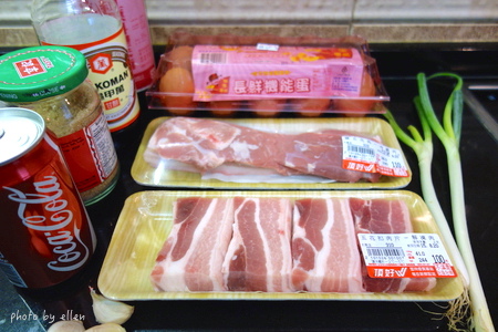家附近最近的超市是頂好, 那天看到兩種五花肉, 方整形狀的是五花扣肉片, 油脂部位比較少, 另一種長條五花肉可以隨意切成自己喜歡的尺寸大小, 肥肉多, 看自己喜歡 我是兩種都用, 這樣家人想吃瘦肉或肥肉多一點的都可以滿足到 XD 蒜整粒去皮不用拍碎, 蔥洗淨切段