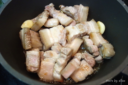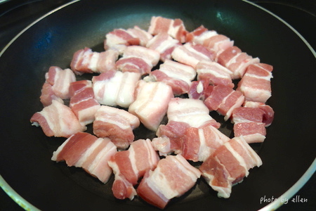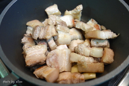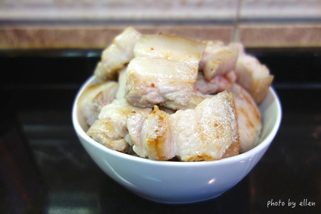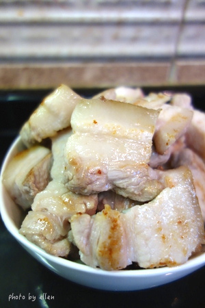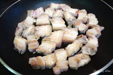 鍋子乾煎逼油, 有人會先川燙豬肉我是沒有, 不過我逼出的油是倒掉不用的 我不喜歡豬肉會有的一種臭味, 所以看是要先川燙再煎或是直接煎後油倒掉不用都可以