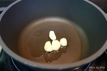 冷油放入蒜頭爆香, 這時候喜歡吃辣的可以同時加點辣椒提味 不熱油後再爆香蒜頭是因為怕會燒焦, 所以冷油的時候放進去, 等到聞到蒜頭香味時油就準備好了